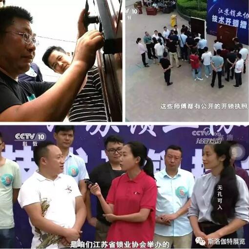 2019年11月20日 18:50 “CCTV我愛(ài)發(fā)明” 欄目播出了《無(wú)孔可入》節(jié)目?!鞍布沃悄苕i”李玉云發(fā)明的轉(zhuǎn)盤(pán)式密碼鎖,于9月16日在南京街頭擺下擂臺(tái)賽,誠(chéng)邀各路開(kāi)鎖大師前來(lái)挑戰(zhàn)。江蘇省鎖業(yè)協(xié)會(huì)會(huì)員十余人在會(huì)長(zhǎng)李小輝的帶領(lǐng)下,向開(kāi)鎖大師發(fā)起挑戰(zhàn)。