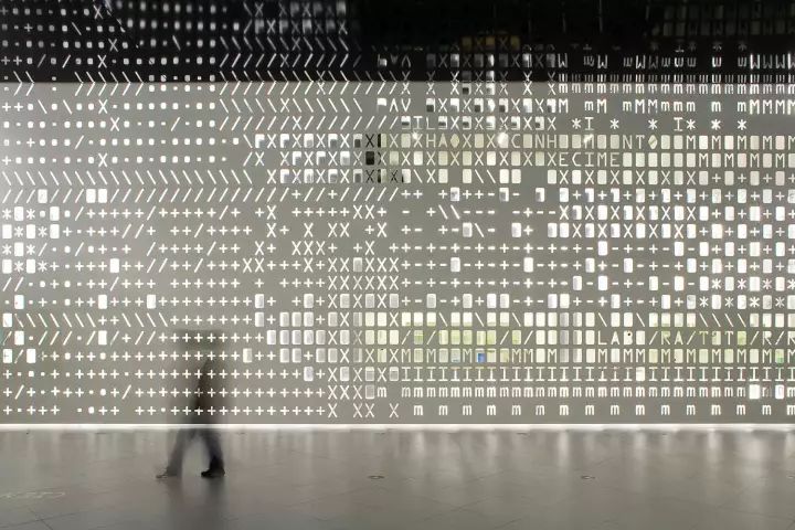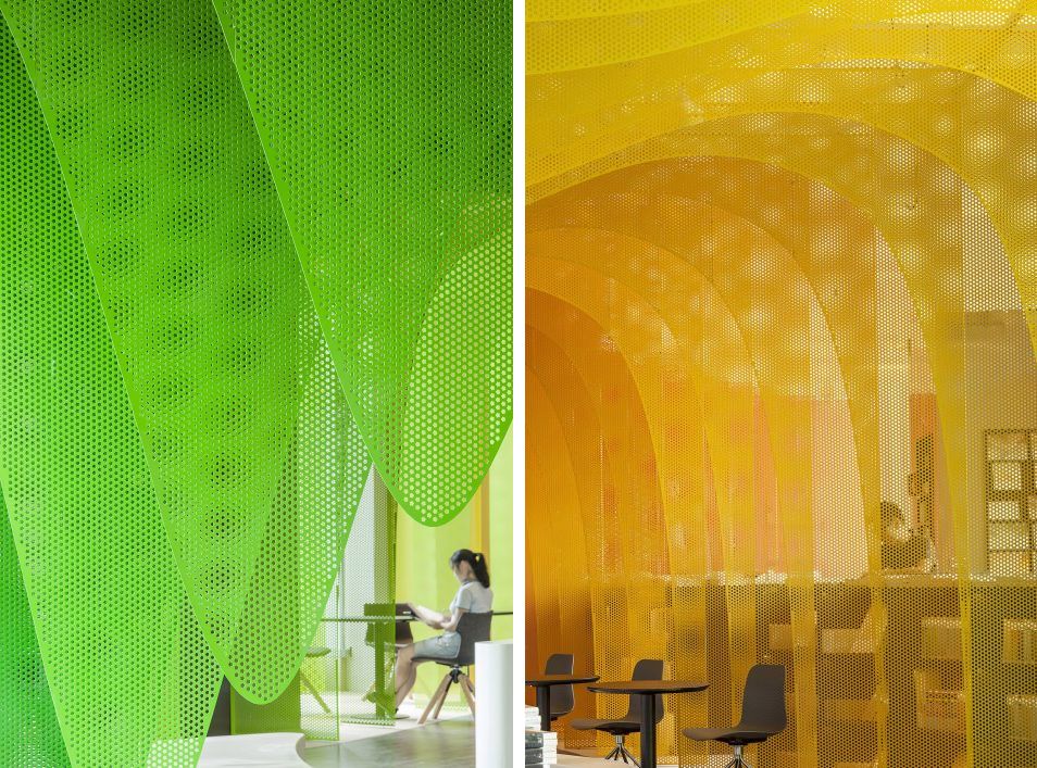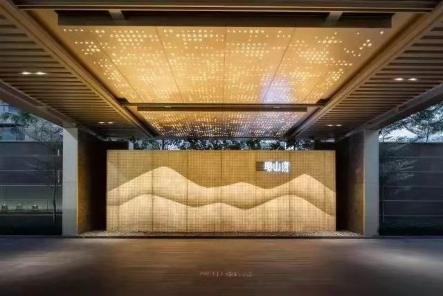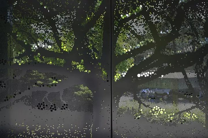 穿孔鋁板通過大小疏密的設(shè)計(jì),在背景燈箱下呈現(xiàn)出優(yōu)雅的山巒之韻
