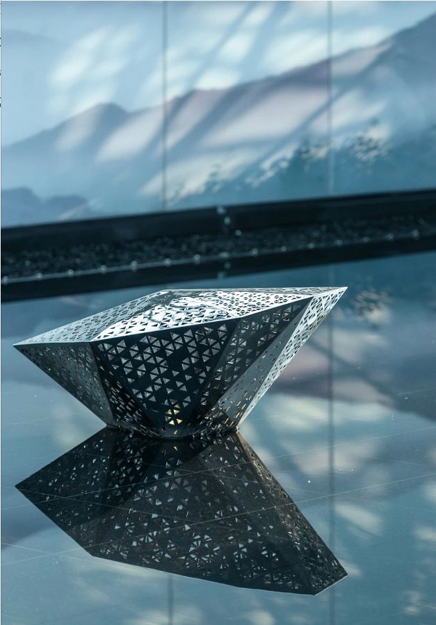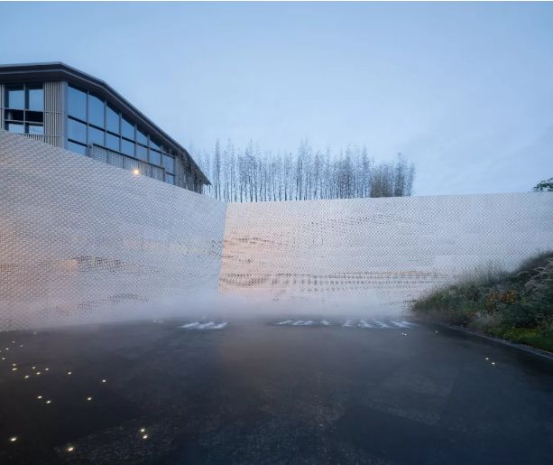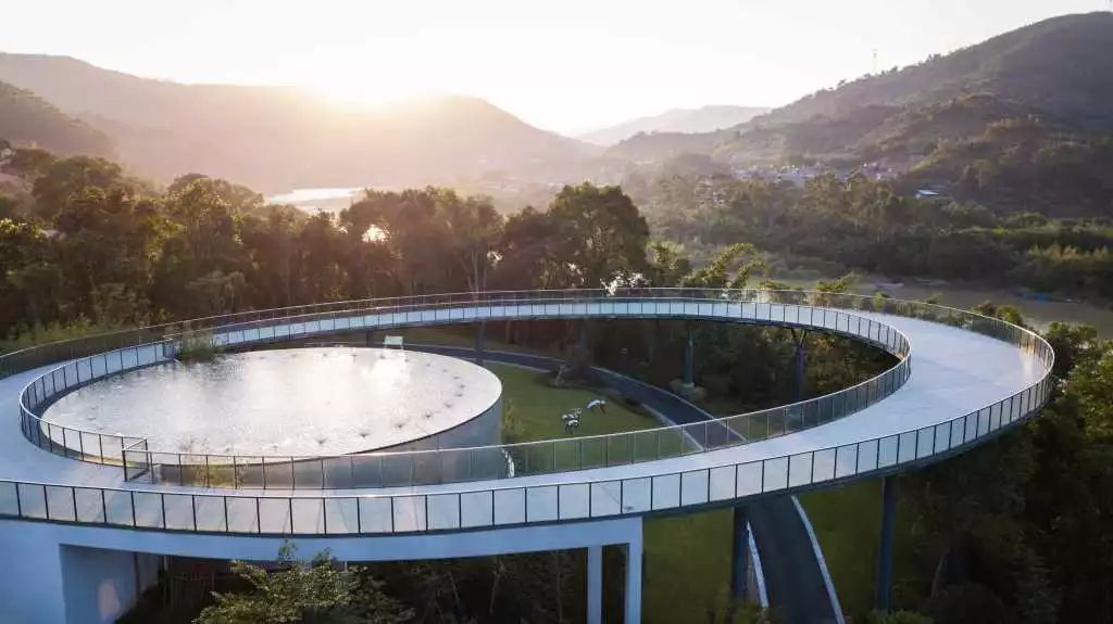 觀景臺內(nèi)切一個(gè)直徑約22米的鏡面水景,設(shè)計(jì)師通過反復(fù)推敲比例,寬窄,與空間關(guān)系,最終在水景立面運(yùn)用穿孔鋁板結(jié)合燈光再現(xiàn)了一幅《千里江山圖》。