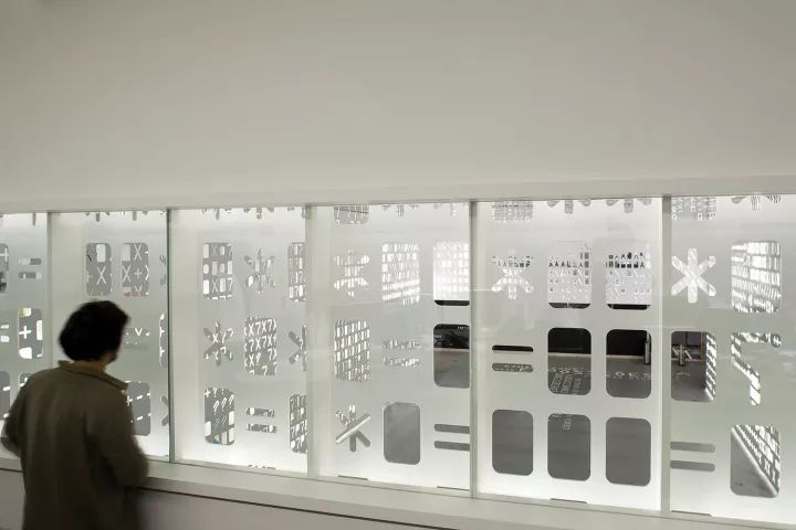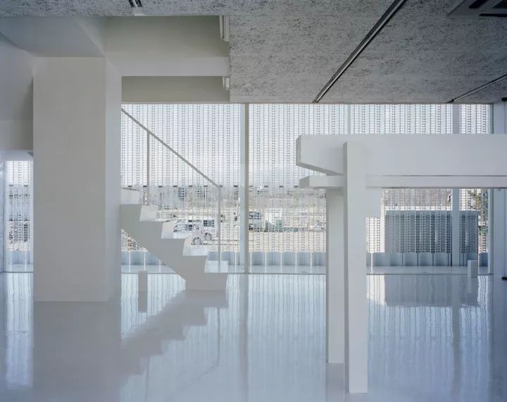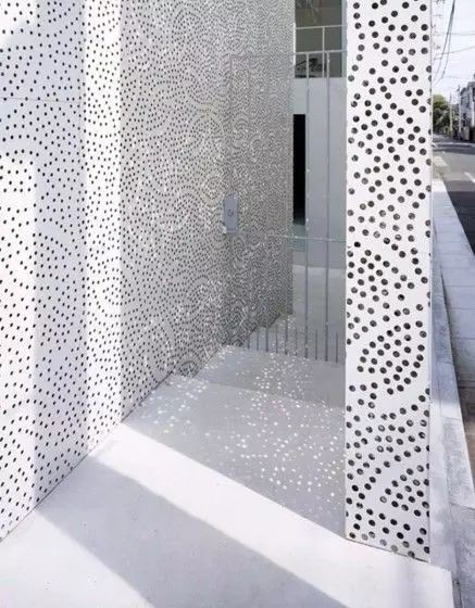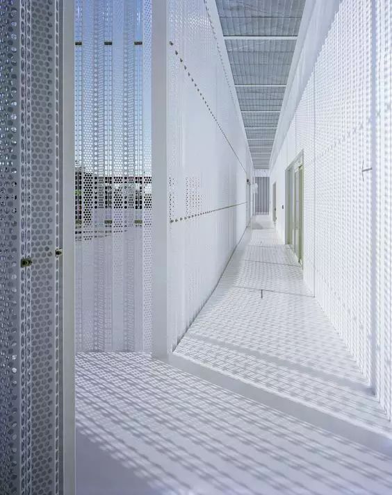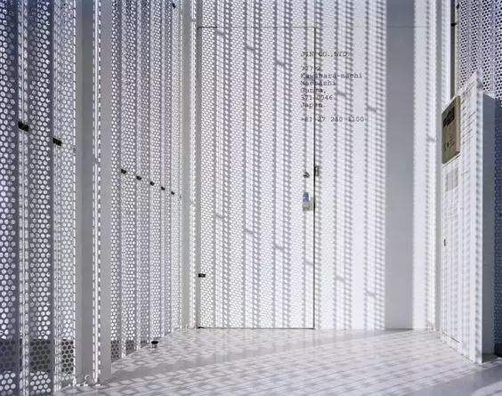 日本前橋市的JIN CO LTD辦公樓在廊道與建筑立面大量應(yīng)用的白色的穿孔板折疊的穿孔板與立面的白色水泥墻形成獨(dú)特的紋理在空間的感受下,以及與日光的映射下帶給人們獨(dú)特的空間體驗(yàn)