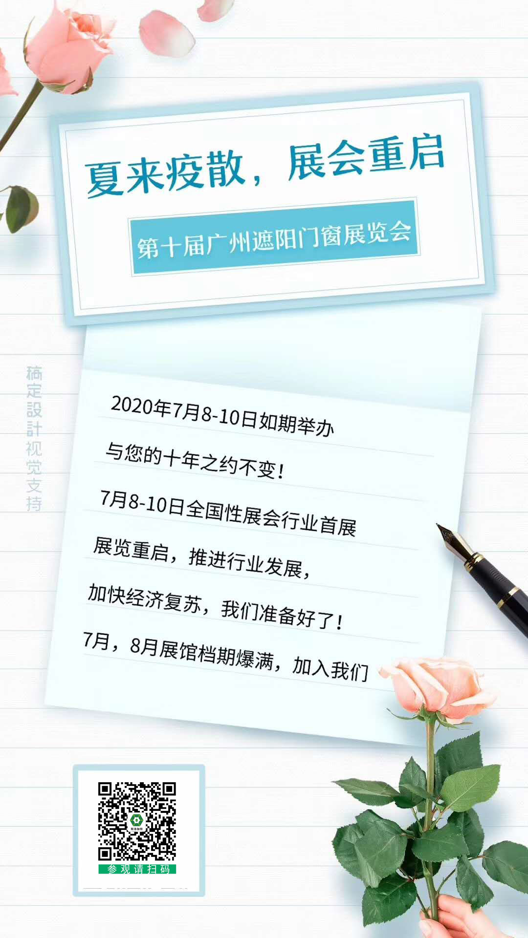 在距2020第十屆廣州遮陽(yáng)門窗展開幕之日還有55天之際,國(guó)務(wù)院應(yīng)對(duì)新型冠狀病毒感染肺炎疫情聯(lián)防聯(lián)控機(jī)制,廣東省衛(wèi)生健康委會(huì)員宣布開放舉辦會(huì)展活動(dòng),為會(huì)展業(yè)按下了啟動(dòng)鍵。讓我們鄭重期待,7月8-10日,廣州遮陽(yáng)門窗展將如期舉辦,與您不變的十年之約。