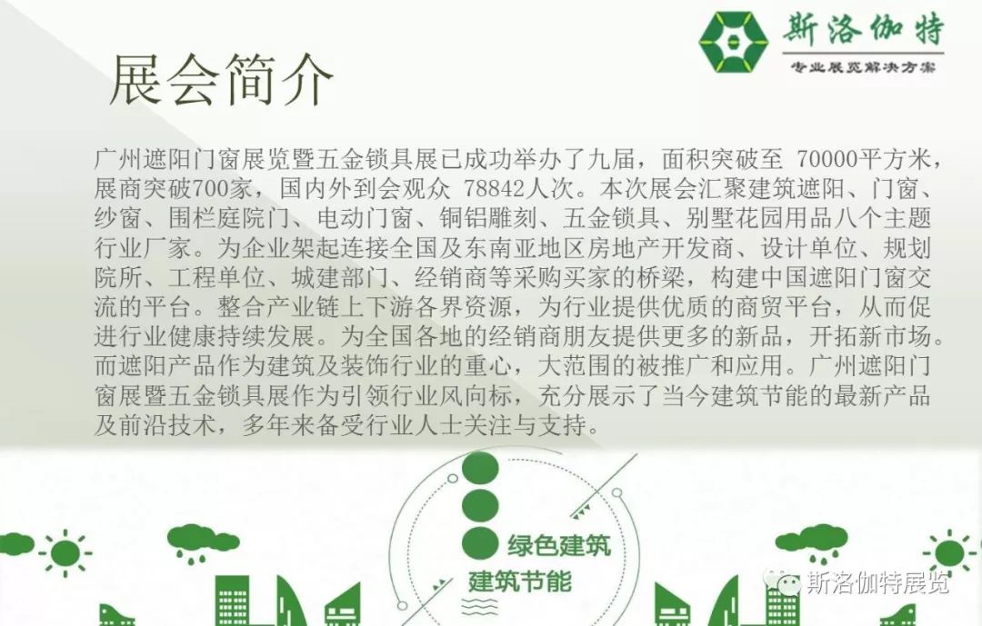 “辭九迎十” 廣州遮陽門窗展即將迎來第十個年頭,面對新的征程,斯洛伽特展覽人帶著“合作——共贏——跨越”的理念,總結(jié)經(jīng)驗,裝備自己,繼續(xù)加快發(fā)展的步伐,正視面臨種種的問題與困難,步入快速穩(wěn)定發(fā)展的軌道,迎接“破十”的一年!